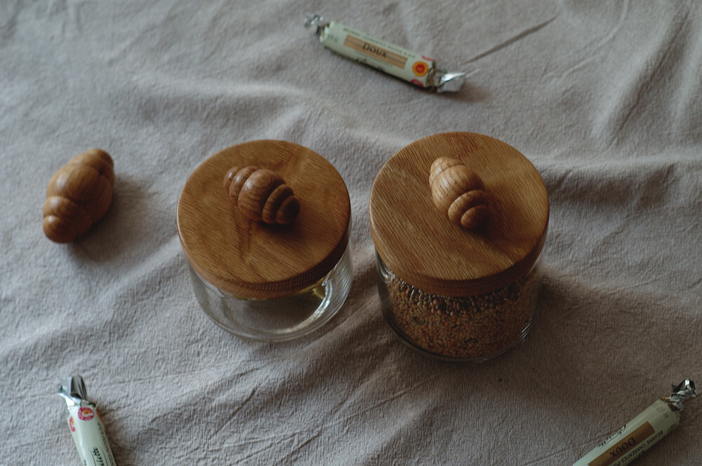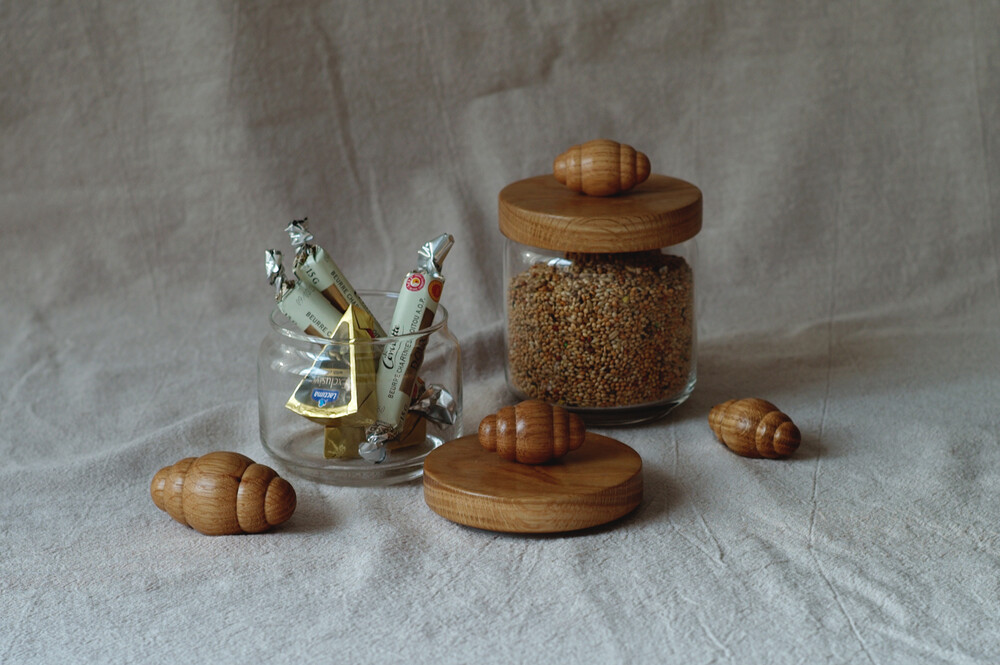 고소한 향이 날 것 같은 크루아상 오브제가 올라간 유리용기 입니다.